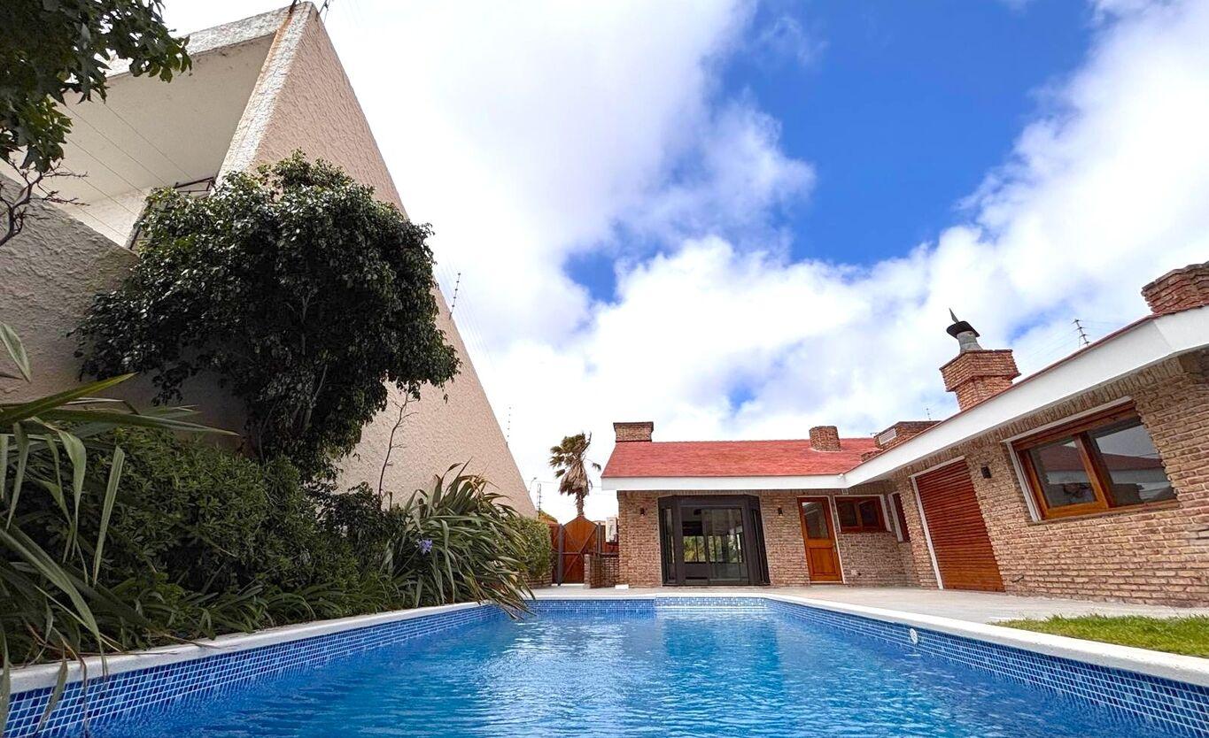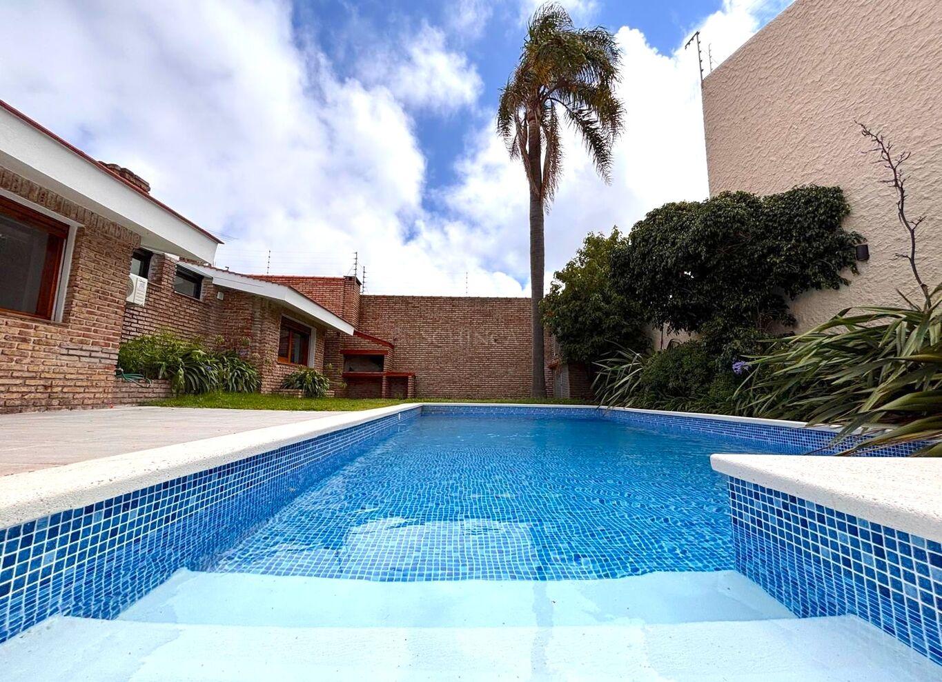 Jardín al frente; fondo con patio, parrillero y piscina de material de buenas dimensiones.