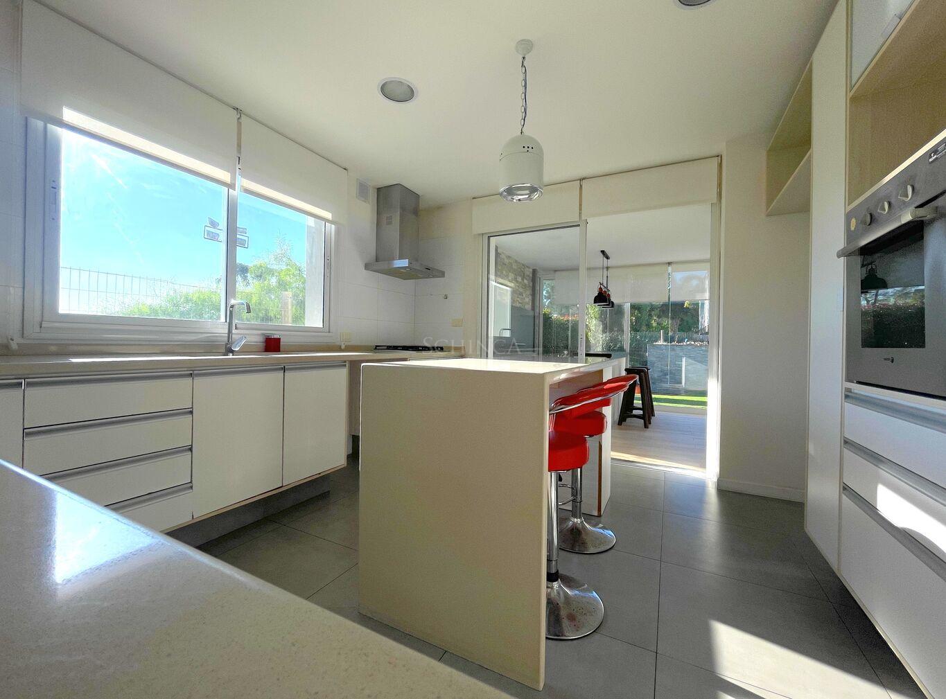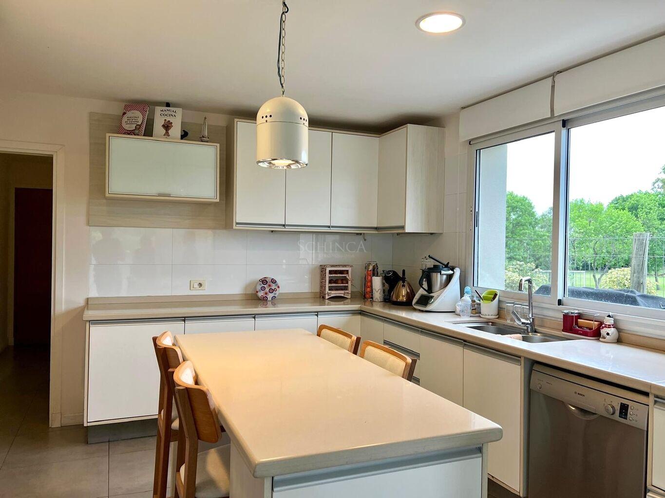 La cocina definida con diseño de circulación 360°, está equipada con isla central de silestone, amplios placares bajo y sobre mesada, anafe a gas, horno empotrado y campana extractora. Un espacio pensado para disfrutar de la gastronomía con comodidad y estilo.